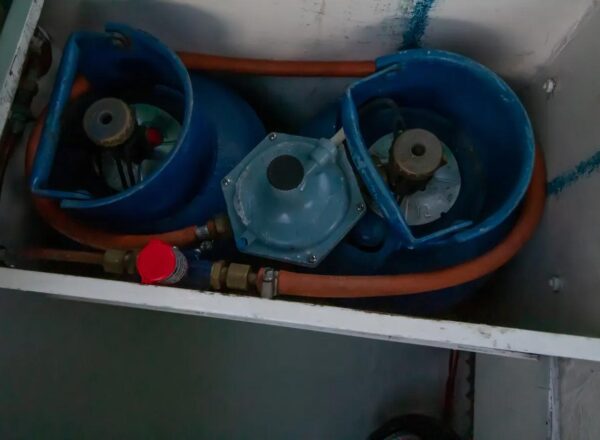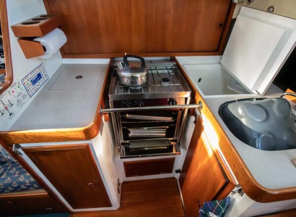 - Cooker: Force 10 gas stove two gas bottles in cockpit locker vented to the side and Aide leak tester. Certificated 2014